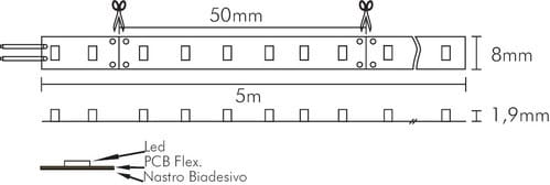 ** Caratteristiche Generali **Applicazione: DecorativaTempo di vita L70B50: 20000hNumero cicli di accensione: 10000 cicliTipo nastro: RGBColore Supporto: BiancoTipo di led: smd 3535n. Led al metro: 120 led/mLunghezza max in cascata: 5mRischio fotobiologico: Esente** Caratteristiche di Illuminazione **Colore: RGBFlusso Nastro Led: 740lm/mFlusso: R:180lm/m G:450lm/m B:115lm/mLunghezza d'onda: R:624nm G:525nm B:470nmAngolo di emissione: 120°Warm-up (60%): 0.1s** Caratteristiche Elettriche**Potenza Nastro Led: 14.4W/mPotenza unità minima: 0.72WTens. funzionamento DC: 24VdcDimmerabile: siAlimentatore: Esterno (non incluso)** Caratteristiche Meccaniche **Lunghezza nastro: 5mN. Led/taglio: 6Lunghezza taglio minima: 50mmLarghezza: 8mmSpessore: 1.9mmFissaggio: Biadesivo 3MGrado di protezione: IP20Tipo di protezione: NessunoConnessioni: Cavo libero** Caratteristiche Termiche **Temp. di funzionamento: -10 / 40°C