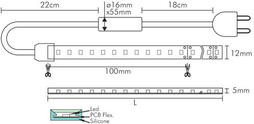 Striscia LED alimentata direttamente a 230Vac, non necessita di alcun driver.Il tubo siliconico IP65 presenta nel retro il biadesivo 3M per una facile installazione.** Caratteristiche Generali **Tempo di vita L70B50: 20000hNumero cicli di accensione: 10000 cicliFattore di sopravvivenza: 0.9Tipo nastro: MonocoloreColore Supporto: BiancoTipo di led: smd 2835n. Led al metro: 120 led/mLunghezza max in cascata: 100mRischio fotobiologico: Esente** Caratteristiche di Illuminazione **Colore: Bianco caldoFlusso Nastro Led: 1400lm/mFlusso @ 50cm: 700lmCRI: 80Warm-up (60%): 0.1sFattore mantenimento flusso: 0.96Uniformità colore (SDCM): 6** Caratteristiche Elettriche **Classe energetica: FPotenza Nastro Led: 15W/mPotenza 50cm: 7.5WPotenza unità minima: 1.5WFattore di potenza PF: 0.9Fattore di sfasamento DF: 0.5Tens. funzionamento AC: 230VacTolleranza d'ingresso: ±10%Frequenza: 50HzDimmerabile: si** Caratteristiche Sorgente Luminosa **Temp. Colore: 3000K** Caratteristiche Meccaniche **Lunghezza nastro: 20mN. Led/taglio: 12Lunghezza taglio minima: 100mmLarghezza: 12mmSpessore: 5mmAltezza: 20000mmFissaggio: Biadesivo 3MGrado di protezione: IP65Resistenza agli urti: IK08Tipo di protezione: Tubo siliconicoConnessioni: Spina** Caratteristiche Termiche **Temp. di funzionamento: -10 / 40°CLa striscia deve essere collegata direttamente alla rete 230V 50Hz.Si raccomanda l’installazione in posizione inaccessibile a persone o animali.Fusibile di protezione in testa per laprotezione dell’intera striscia.