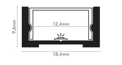 ** Caratteristiche generali ** Composto da: -n. 1 profilo di alluminio -n. 1 copertura ** Caratteristiche Elettriche ** Potenza dissipabile (35°C): 15W/m ** Caratteristiche Meccaniche ** Lunghezza profilo: 2m Larghezza: 18.4mm Larghezza interna: 12.4mm Altezza: 9.6mm Montaggio: A parete, A soffitto Grado di protezione: IP20 Materiale corpo: Alluminio verniciato Colore corpo: Nero Diffusore: Policarbonato opaco ** Attenzione ** La copertura in PMMA è più resistente alle temperature e ai raggi UV rispetto alla copertura in Policarbonato (PC). II profilo illustrato è un componente. Il suo corretto funzionamento con nastri led o moduli led dipende da importanti requisiti di installazione e dimensionamento. La potenza dissipabile è stata calcolata considerando una temperatura ambiente non superiore a 35°C in aria. Condizioni di installazione differenti devono essere opportunamente verificate da personale tecnico. Utilizzare la copertura solo con nastri led IP20. Alpha Elettronica declina ogni responsabilità per danni o malfunzionamenti derivati da un uso inappropriato del profilo.