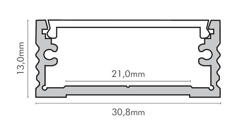 ** Caratteristiche generali ** Composto da: -n. 1 profilo di alluminio -n. 1 copertura ** Caratteristiche Elettriche ** Potenza dissipabile (35°C): 30W/m ** Caratteristiche Meccaniche ** Lunghezza profilo: 2m Larghezza: 30.8mm Larghezza interna: 21mm Altezza: 13mm Grado di protezione: IP20 Materiale corpo: Alluminio Colore corpo: Naturale Diffusore: PMMA opaco ** Attenzione ** La copertura in PMMA è più resistente alle temperature e ai raggi UV rispetto alla copertura in Policarbonato (PC). Il profilo illustrato è un componente. Il suo corretto funzionamento con nastri led o moduli led dipende da importanti requisiti di installazione e dimensionamento. La potenza dissipabile è stata calcolata considerando una temperatura ambiente non superiore a 35°C in aria. Condizioni di installazione differenti devono essere opportunamente verificate da personale tecnico. Utilizzare la copertura solo con nastri led IP20. Alpha Elettronica declina ogni responsabilità per danni o malfunzionamenti derivati da un usoinappropriato del profilo.