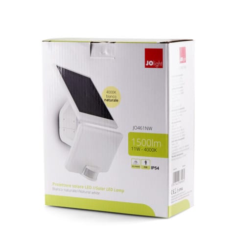 ** Caratteristiche Generali **Tempo di vita L70B50: 20000hNumero cicli di accensione: 15000 cicliRischio fotobiologico: Esente** Caratteristiche di Illuminazione **Colore: Bianco naturaleFlusso: 1500lmCRI: 80Angolo di emissione: 120°** Caratteristiche Elettriche **Potenza: 11WDimmerabile: no** Caratteristiche Sorgente Luminosa **Temp. Colore: 4000K** Caratteristiche Meccaniche **Fissaggio: Staffe Incluse, Tramite vitiMontaggio: A pareteGrado di protezione: IP54Materiale corpo: PlasticaColore corpo: BiancoDiffusore: Policarbonato opacoConnessioni: Connettori e cavetti inclusiTipo Controllo: Sensore PIRLunghezza cavo: 3mOrientabile: si** Regolazioni **Periodo di accensione: 10s - 60minLivello di luminosità: 30 - 1000lux** Caratteristiche Termiche **Temp. di funzionamento: -10 / 40°C** Caratteristiche Batteria **Pacco batteria incluso: Li-Ion 18650 4000mAhDurata: 1h (100% luminosità), 18h (5% luminosità)Tempo di ricarica: 10h** Caratteristiche Pannello solare **Potenza: 2,5WTensione Voc: 5,5VLunghezza cavo: 3m** Caratteristiche PIR **Angolo: 120°Area di rilevamento: 10mAltezza di installazione: Max 4m** Modalità di funzionamento **I: la lampada sarà spento fino al rilevamento del movimento, dove si accenderà al 100%;II: la lampada rimarrà accesa al 5% fino al rilevamento del movimento, dove si accenderà al 100%;** Contenuto confezione: **- Proiettore + pannello solare;- Kit di fissaggio;- Istruzioni