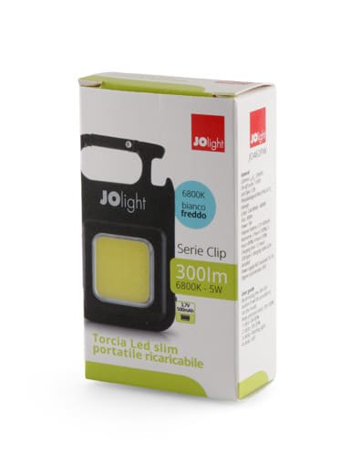 Pratica mini torcia tascabile a batteria con staffa pieghevole (180°), portachiavi, apribottiglie e base magnetica.Tramite il selettore posto sul lato sarà possibile scegliere la modalità di funzionamento per soddisfare le diverse esigenze:- Alta luminosità 80% (durata di circa 3 ore)- Bassa luminosità 50% (durata di circa 4 ore)- Flash strobo- Super luminosità 100% (durata di circa 2 ore)LED laterale di segnalazione stato di batteria.Il tempo di ricarica della batteria ai polimeri di litio da 500mAh è di circa 1,5 ore tramite porta USB Tipo-C.La staffa pieghevole a 180° consente di posizionarla ad angolazioni diverse o di appenderla in determinati luoghi.Foro filettato per il fissaggio su monopiede, slider, treppiede, ecc.Sul retro è presente un magnete per poter fissare agevolmente la torcia ad una superficie metallica.** Caratteristiche Generali **Tempo di vita L70B50: 20000hNumero cicli di accensione: 15000 cicliTipo di led: COBRischio fotobiologico: Esente** Caratteristiche di Illuminazione **Colore: Bianco freddoFlusso: 300lm** Caratteristiche Elettriche **Potenza: 5WDimmerabile: noAlimentatore: Esterno (non incluso)** Caratteristiche Sorgente Luminosa **Temp. Colore: 6800K** Caratteristiche Meccaniche **Lunghezza: 45mmLarghezza: 20mmAltezza: 61mmFissaggio: Staffe IncluseGrado di protezione: IPX3Materiale corpo: Alluminio verniciatoColore corpo: NeroTipo Controllo: Interruttore integrato** Caratteristiche Termiche **Temp. di funzionamento: -10 / 50°CConnettore di ricarica USB tipo "C"incluso.Alimentatore NON Incluso: 5V 1A.