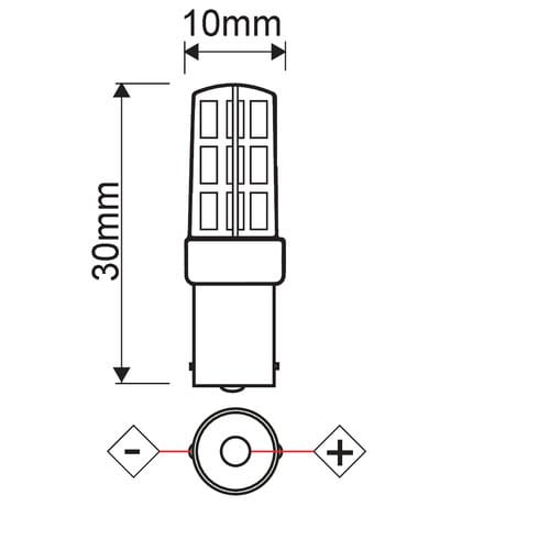 ** Caratteristiche Generali **Tempo di vita L70B50: 20000hNumero cicli di accensione: 10000 cicliFattore di sopravvivenza: 0.9Tipo di led: smd 3014Numero Led: 24Rischio fotobiologico: Esente** Caratteristiche di Illuminazione **Colore: Bianco freddoFlusso: 140lmCRI: 80Angolo di emissione: 270°Starting time: 0.2sFattore mantenimento flusso: 0.96Uniformità colore (SDCM): 6** Caratteristiche Elettriche **Classe energetica: FPotenza: 1.5WTens. funzionamento DC: 12Vdc (10‑15Vdc)Tens. funzionamento AC: 12VacFrequenza: 50-60HzDimmerabile: no** Caratteristiche Sorgente Luminosa **Temp. Colore: 6500K** Caratteristiche Meccaniche **Attacco: BA9sLunghezza: 10mmLarghezza: 10mmAltezza: 30mmDiametro: ø10mm** Caratteristiche Termiche **Temp. di funzionamento: -10 / 40°C