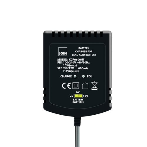 ** Caratteristiche **Adatto per batterie:- 2V - capacità compresa da 1,3Ah a 12Ah- 6V - capacità compresa da 1,3Ah a 12Ah- 12V - capacità compresa da 1,3Ah a 12AhTensione di uscita regolabile tramite selettoreTerminali intercambiabili inclusi** Caratteristiche Generali **Tecnologia: switchingCostruzione: pluginClasse isolamento: IIAdatto per batterie: Piombo GEL, AGM, Pb-CaGrado Protezione: IP20** Caratteristiche Elettriche **Terminazione di carica: corrente minimaRegolazione uscita: commutatore manualeTensione d'ingresso: 100‑240VacFrequenza: 50/60HzCorrente d'uscita: 600mATensione d'uscita: 2 - 12VProtezioni: sovratemperatura, corto circuito, inversione** Caratteristiche Meccaniche **Dimensioni (LxWxH): 82 x 56 x 80mmRaffreddamento: passivoMateriale contenitore: PlasticoColore: NeroConnessioni: connettore fissoConnettori: Pinze** Caratteristiche Termiche **Temperatura di lavoro: 0/40°C** Indicazioni Led **- Led Verde acceso: batteria in carica- Led Rosso: acceso: inversione di batteria- Led spento: fine carica/stand by con corrente ≤30mA** se la corrente di mantenimento assorbita dalla batteria rimane maggiore di 30mA anche quando essa è completamente carica, allora il led non si spegne.Connettore d'uscita:Spine reversibili. Vedi dettaglio