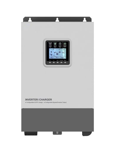 Inverter ottimizzato per la gestione di diverse fonti di energia.Regolatore di carica MPPT integrato.Caricabatterie da rete o generatore integrato.Adatto per batterie piombo AGM/GEL e Litio.Con display LCD per la configurazione dei parametri.SupportaDue modalità di funzionamento: con batteria e senza batteria.Tre modalità di carica: solo solare, priorità solare, rete e solare.Due modalità di rete AC: priorità inverter e priorità rete elettrica.** Caratteristiche Generali **Tipologia inverter:con cariacabatterie e bypass 230VModalità funzionamento: Priorità AC (UPS), Priorità DCRaffreddamento: Convezione forzata - ventola automaticaFunzioni aggiuntive: Contatto on-off remoto, Porta comunicazione RS485Interfaccia di controllo: RS485** Caratteristiche Inverter **Forma d'onda in uscita: Sinusoidale puraFrequenza: 50HzDistorsione d'onda THD: