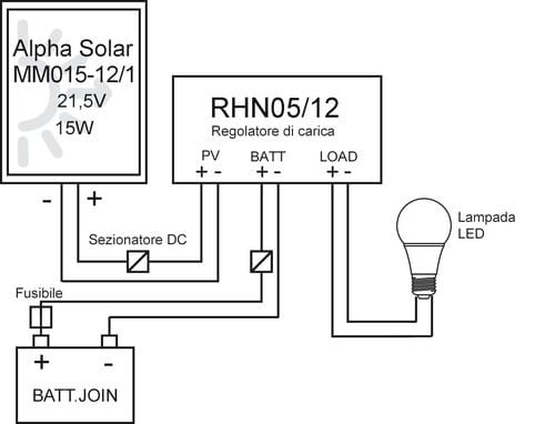 Il ** KIT15-SB ** è un sistema fotovoltaico particolarmente adatto per illuminare punti luce o piccoli accessori con assorbimenti ridotti in aree isolate dalla rete elettrica.Per il suo funzionamento è necessario completare l’impianto con una batteriaal piombo AGM o GEL.Il regolatore è dotato di pulsante per accensione e spegnimento manuale della lampada.E' possibile impostare la durata (in ore) del periodo di accensione della lampada.La lampada si accenderà dal tramonto del sole per il numero di ore impostate (compatibilmente con l'autonomia della batteria). La funzione "crepuscolare"evita la necessità di installare un crepuscolare esterno.La modularità dell’impianto permette un ampliamento di potenza aggiungendo semplicemente altri pannelli in parallelo.Attenzione: l'impiego di un inverter determina consumi (di funzionamento e di stand-by) che riducono drasticamente l'autonomia dell'impianto.Non collegare l'ingresso dell'inverter al morsetto LOAD del regolatore di carica. Collegare l'inverter direttamente alla batteria.Batterie e cavi di collegamento non inclusi.** Articoli inclusi **- 1x MM015-12/1- 1x RHN20/3- 1x LB122/1WW