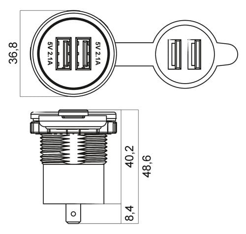 ** Caratteristiche Generali **Tecnologia: dc-dc switching non isolatoGrado Protezione: IP50** Caratteristiche Elettriche **Tensione d'ingresso: 12‑28VdcPotenza: 21WTensione d'uscita: 5VCorrente d'uscita: 4200mATolleranza tensione d'uscita: ±5%Protezioni: corto circuito** Caratteristiche Meccaniche **Dimensioni (LxWxH): 36.8 x 36.8 x 48.6mmMateriale contenitore: PlasticoColore: NeroConnessioni: faston 6,3Connettori: USB tipo"A"** Caratteristiche Termiche **Temperatura di lavoro:0/40°C** Anello luminoso: ** Blu