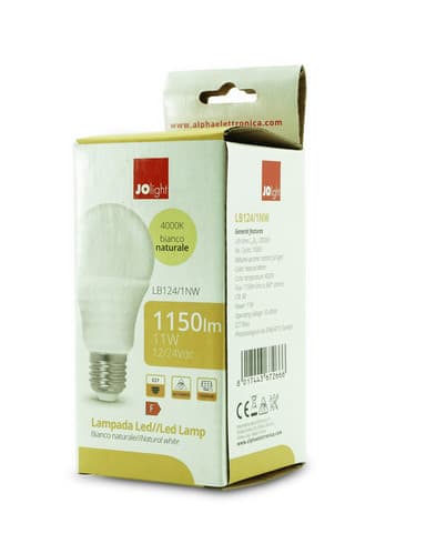 ** Caratteristiche Generali **Tipo lampada: BulboTempo di vita L70B50: 20000hNumero cicli di accensione: 10000 cicliFattore di sopravvivenza: 0.95Rischio fotobiologico: Esente** Caratteristiche di Illuminazione **Colore: Bianco naturaleFlusso: 1150lmCRI: 80Starting time: 0.2sFattore mantenimento flusso: 0.95Uniformità colore (SDCM): 6** Caratteristiche Elettriche **Classe energetica: FPotenza: 11WFattore di sfasamento DF: 0.7Corrente ingresso max: 910mATens. funzionamento DC: 10‑30VdcDimmerabile: no** Caratteristiche Sorgente Luminosa **Temp. Colore: 4000K** Caratteristiche Meccaniche **Attacco: E27Lunghezza: 60mmLarghezza: 60mmAltezza: 121mmDiametro: ø60mmColore corpo: BiancoDiffusore: Policarbonato opaco** Caratteristiche Termiche **Temp. di funzionamento: -10 / 40°C