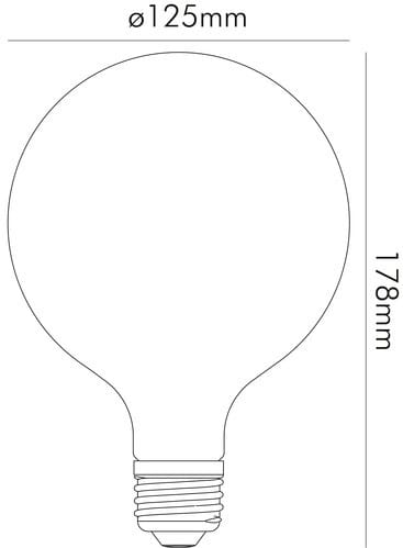 ** Caratteristiche Generali **Tipo lampada: GloboTempo di vita L70B50: 20000hNumero cicli di accensione: 10000 cicliFattore di sopravvivenza: 0.9Tipo di led: FilamentoRischio fotobiologico: Esente** Caratteristiche di Illuminazione **Colore: Bianco caldoFlusso: 1521lmCRI: 80Angolo di emissione: 360°Starting time: 0.2sFattore mantenimento flusso: 0.96Uniformità colore (SDCM): 6** Caratteristiche Elettriche **Classe energetica: DPotenza: 11WFattore di potenza PF: 0.9Fattore di sfasamento DF: 0.7Corrente ingresso max: 55mATens. funzionamento AC: 230VacTolleranza d'ingresso: ±10%Frequenza: 50-60HzDimmerabile: si** Caratteristiche Sorgente Luminosa **Temp. Colore: 2700K** Caratteristiche Meccaniche **Attacco: E27Lunghezza: 125mmLarghezza: 125mmAltezza: 178mmDiametro: ø125mmDiffusore: Vetro trasparente** Caratteristiche Termiche **Temp. di funzionamento: -10 / 40°C