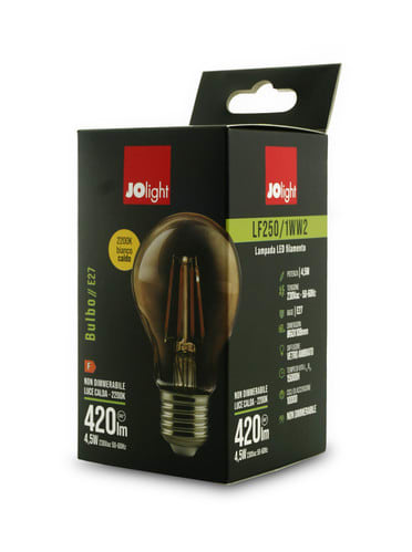 ** Caratteristiche Generali **Tipo lampada: BulboTempo di vita L70B50: 15000hNumero cicli di accensione: 10000 cicliFattore di sopravvivenza: 0.9Tipo di led: FilamentoRischio fotobiologico: Esente** Caratteristiche di Illuminazione **Colore: Bianco caldoFlusso: 420lmCRI: 80Starting time: 0.2sFattore mantenimento flusso: 0.93Uniformità colore (SDCM): 6** Caratteristiche Elettriche **Classe energetica: FPotenza: 4.5WFattore di sfasamento DF: 0.54Tens. funzionamento AC: 230VacTolleranzad'ingresso: ±10%Frequenza: 50-60HzDimmerabile: no** Caratteristiche Sorgente Luminosa **Temp. Colore: 2200K** Caratteristiche Meccaniche **Attacco: E27Lunghezza: 60mmLarghezza: 60mmAltezza: 108mmDiametro: ø60mmDiffusore: Vetro ambrato** Caratteristiche Termiche **Temp. di funzionamento: -10 / 40°C