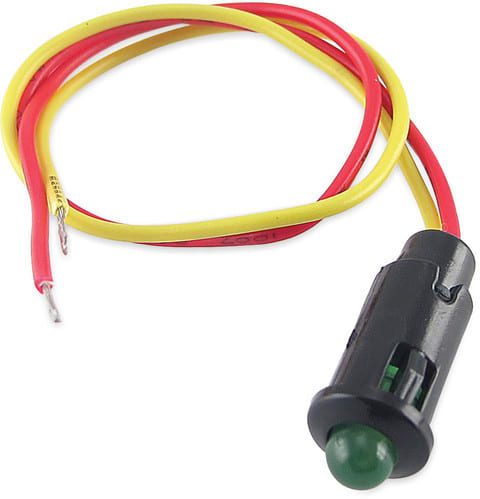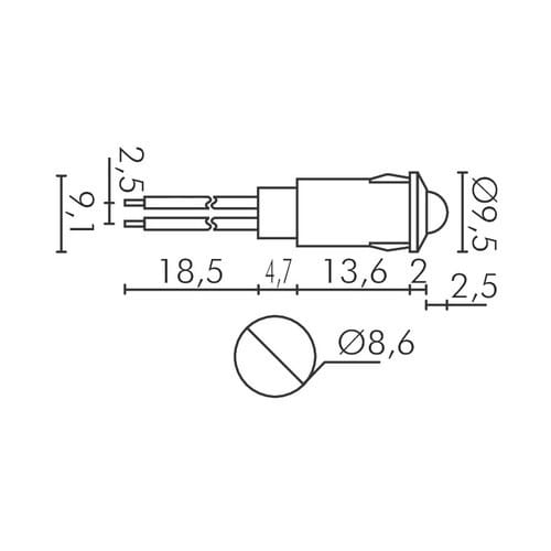 ** Caratteristiche di Illuminazione **Colore: Verde** Caratteristiche Elettriche **Tens. funzionamento DC: 12Vdc** Caratteristiche Meccaniche **Lunghezza: 22.8mmDiametro: ø9.5mmMontaggio: IncassoForo incasso: ø8.6mmMateriale corpo: PlasticaColore corpo: NeroConnessioni: Cavo libero