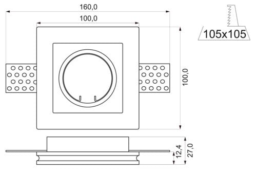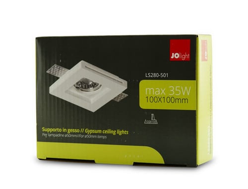 ** Caratteristiche Elettriche **Potenza max installabile: 35W** Caratteristiche Meccaniche **Lunghezza: 100mmLarghezza: 100mmAltezza: 27mmForo incasso: 105 x 105mmGrado di protezione: IP20Materiale corpo: GessoColore corpo: BiancoFinitura: OpacaDiffusore: NessunoOrientabile: noCover in vetro non prevista.Lampadina e portalampada non inclusi.Utilizzare esclusivamente i portalampade indicati:GU10 (230V): 23-9-104/3GU5.3 (12V): 23-9-106/3
