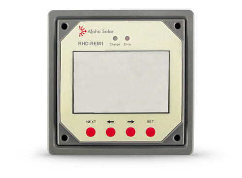 ** Caratteristiche generali **Display per regolatore di carica con gestione di due batterie.Indicazione delle impostazioni dell'impianto.Collegamento interno con negativo comune.Il display remoto RHD-REM consente di visualizzare i parametri del regolatore di carica RHD a doppia batteria.Può essere montato a parete oppure a incasso. Cavo di collegamento incluso.** Dati visualizzati ** (Valori istantanei)** Pannelli **- Tensione- Corrente- Corrente massima- Energia di carica- Frequenza di PWM- Eventuali anomalie** Batteria (1 e 2) **- Tensione- Tensione Minima- Tensione Massima- Temperatura- Eventuali anomalie