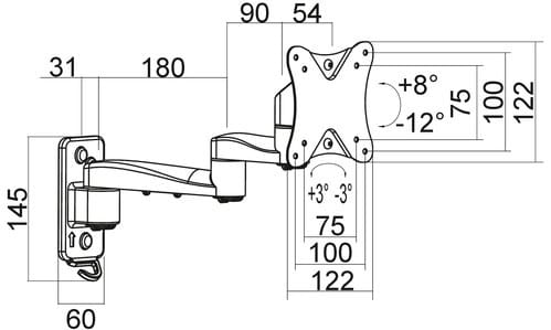 Possibile rimuovere i bracci e scegliere la configurazione di installazione.** Caratteristiche Generali **Funzionalità: OrientabileTipologia montaggio: Da pareteAdatto per tv da: 13"- 27"Compatibilità VESA Max: 100x100mmCompatibilità VESA: 75x75, 100x100Estensione: Braccio doppioRotazione (Pivot): -3° +3°Inclinazione (Tilt): -12° +8°Orientamento (Swivel): -90° +90°Colore: Nero** Caratteristiche Meccaniche **Avanzamento TV: ManualeMateriale: AcciaioDistanza dal muro: 35.5cmPortata: 20KgBolla di livello: NoSistema di bloccaggio: NoGestione cavi: SiInnesto a baionetta: SiKit di montaggio: Incluso