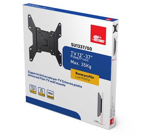 ** Caratteristiche Generali **Funzionalità: FissoTipologia montaggio: Da pareteAdatto per tv da: 13"- 37"Compatibilità VESA Max: 200x200mmCompatibilità VESA: 50x50, 75x75, 100x100, 200x100, 200x200Estensione: NessunaRotazione (Pivot): 0°Inclinazione (Tilt): 0°Orientamento (Swivel): 0°Colore: Nero** Caratteristiche Meccaniche **Materiale: AcciaioDimensioni (WxH): 220mm x 220mmDistanza dal muro: 1.2cmDistanza fori: 200x200mmPortata: 35KgPeso prodotto: 0.7KgBolla di livello: NoSistema di bloccaggio: SiGestione cavi: NoInnesto a baionetta: NoKit di montaggio: Incluso