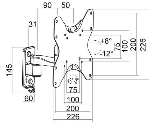 Possibile rimuovere il braccio e scegliere la configurazione di installazione.** Caratteristiche Generali **Funzionalità: OrientabileTipologia montaggio: Da pareteAdatto per tv da: 23"- 42"Compatibilità VESA Max: 200x200mmCompatibilità VESA: 75x75, 100x100, 200x100, 200x200Estensione: Braccio singoloRotazione (Pivot): -3° +3°Inclinazione (Tilt): -12° +8°Orientamento (Swivel): -90° +90°Colore: Nero** Caratteristiche Meccaniche **Avanzamento TV: ManualeMateriale: AcciaioDistanza dalmuro: 17.1cmPortata: 20KgBolla di livello: NoSistema di bloccaggio: NoGestione cavi: SiInnesto a baionetta: NoKit di montaggio: Incluso