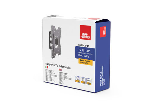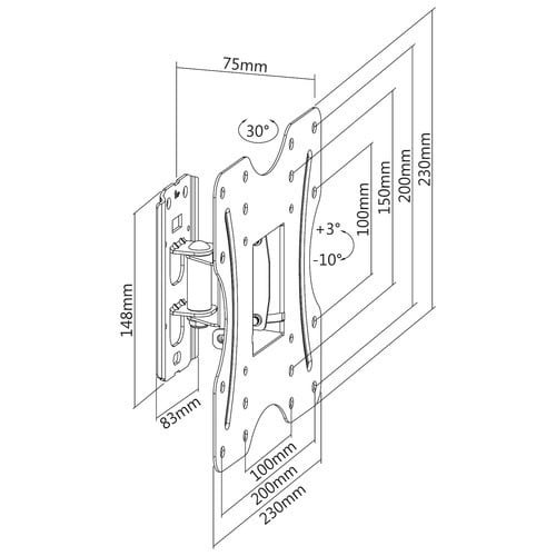 ** Caratteristiche Generali **Funzionalità: OrientabileTipologia montaggio: Da pareteAdatto per tv da: 23"- 42"Compatibilità VESA Max: 200x200mmCompatibilità VESA: 100x100, 100x200, 200x100, 200x200Estensione: NessunaRotazione (Pivot): 0°Inclinazione (Tilt): -10° +3°Orientamento (Swivel): -15° +15°Colore: Nero** Caratteristiche Meccaniche **Avanzamento TV: ManualeMateriale: AcciaioDistanza dal muro: 7.5cmPortata: 30KgBolla di livello: NoSistema di bloccaggio: NoGestione cavi: NoInnesto a baionetta: NoKit di montaggio: Incluso