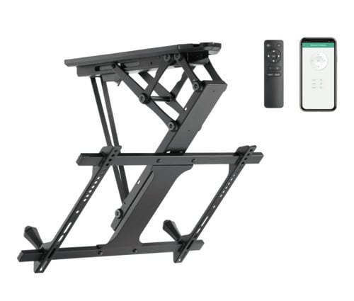 I supporti TV motorizzati da soffitto vengono solitamente scelti dai clienti che preferiscono risparmiare spazio nella stanza che può essere destinato ad altri scopi, senza rinunciare alla comodità di una corretta postazione di visione.Il potente motoredi qualità sostiene TV fino a 70"(35 kg) e abbassa e ritrae i TV in modo fluido e silenzioso, completamente controllabile tramite telecomando o app Tuya.Un meccanismo bilanciato previene qualsiasi vibrazione del soffitto quando la TV è in movimento.Hala funzione di memoria intelligente per andare automaticamente all'angolo impostato, senza la necessità di regolare nuovamente l'angolo ogni volta che viene utilizzato.Questo supporto può essere installato su calcestruzzo.La scelta perfetta per installazioni di visione TV pubbliche o domestiche!- Motore potente: più stabile, forte e durevole- Regolazioni di livellamento: consentono di posizionare perfettamente la TV dopo averla appesa- Telecomando incluso: per facilitare gli spostamenti- Controlloremoto dall'app Tuya- Design ribaltabile: consente un facile stoccaggio, spazio liberato e sicurezza** Caratteristiche Generali **Funzionalità: Orientabile, InclinabileTipologia montaggio: Da soffittoAdatto per tv da: 32"- 70"Compatibilità VESAMax: 600x400mmCompatibilità VESA: 200x100, 200x200, 300x200, 400x200, 300x300, 400x300, 400x400, 600x400, 200x400Estensione: Braccio singoloRotazione (Pivot): -2° +2°Inclinazione (Tilt): 0° +75°Colore: Nero** Caratteristiche Meccaniche **Avanzamento TV: MotorizzatoMateriale: Acciaio, PlasticaLunghezza braccio piegato: 725mmDistanza dal muro: 10.8cmPortata: 35KgBolla di livello: NoSistema di bloccaggio: NoGestione cavi: SiInnesto a baionetta: NoKit di montaggio: Incluso** Specifiche **Finitura superficiale: Verniciatura a polvereColore: Nero opacoDimensioni: 725x664x516mmAdatto alla TV curva: SìTipo pannello: pannello staccabileTipo di piastra a muro: piastra a muro fissaMovimento TV: fluido (senza scatti)Rumore: