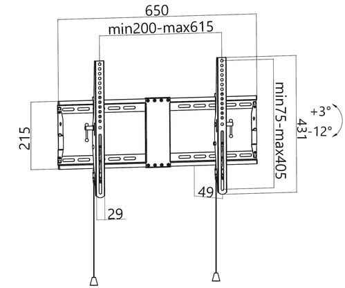 ** Caratteristiche Generali **Funzionalità: InclinabileTipologia montaggio: Da pareteAdatto per tv da: 37"- 80"Compatibilità VESA Max: 600x400mmCompatibilità VESA: 200x200, 300x200, 300x300, 400x200, 400x300, 400x400, 600x400Estensione: NessunaRotazione (Pivot): 0°Inclinazione (Tilt): -12° +3°Orientamento (Swivel): 0°Colore: Nero** Caratteristiche Meccaniche **Avanzamento TV: ManualeMateriale: AcciaioDimensioni (WxH): 650mm x 431mmDistanza dal muro: 4.9cmPortata: 70KgSistema di bloccaggio: SiKit di montaggio: Incluso