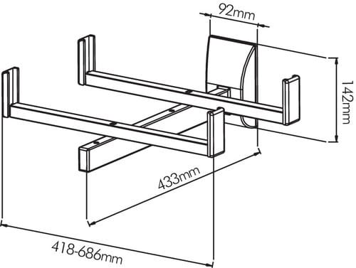 ** Caratteristiche Generali **Tipologia montaggio: Da pareteEstensione: NessunaRotazione (Pivot): 0°Inclinazione (Tilt): 0°Orientamento (Swivel): 0°Colore: Nero** Caratteristiche Meccaniche **Materiale: AcciaioDistanza dal muro: 433cmPortata: 15KgPeso prodotto: 3KgBolla di livello: NoSistema di bloccaggio: NoGestione cavi: NoInnesto a baionetta: No