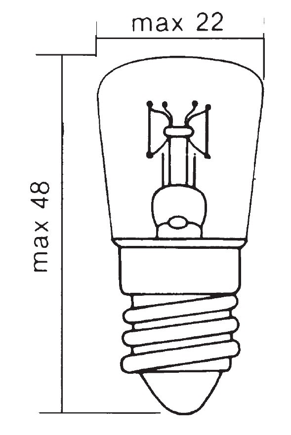 Lampada piccola pera 230 V 15 W. Filamento C-7A. Per forni (300°C). 22x48. Attacco E 14