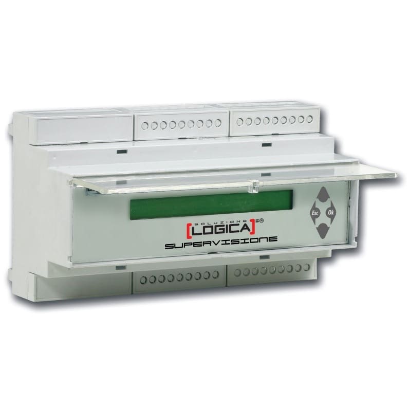 Centrale di supervisione per la gestione contemporanea di più Centrali di controllo (max 32) della serie Logica, tramite bus a 3 fili (RS 485). Dotata di una porta RS485 per connessione remota e una porta RS232 per connessione standard. Display di comando con menù di stampa a scorrimento. Occupa 9 moduli DIN.