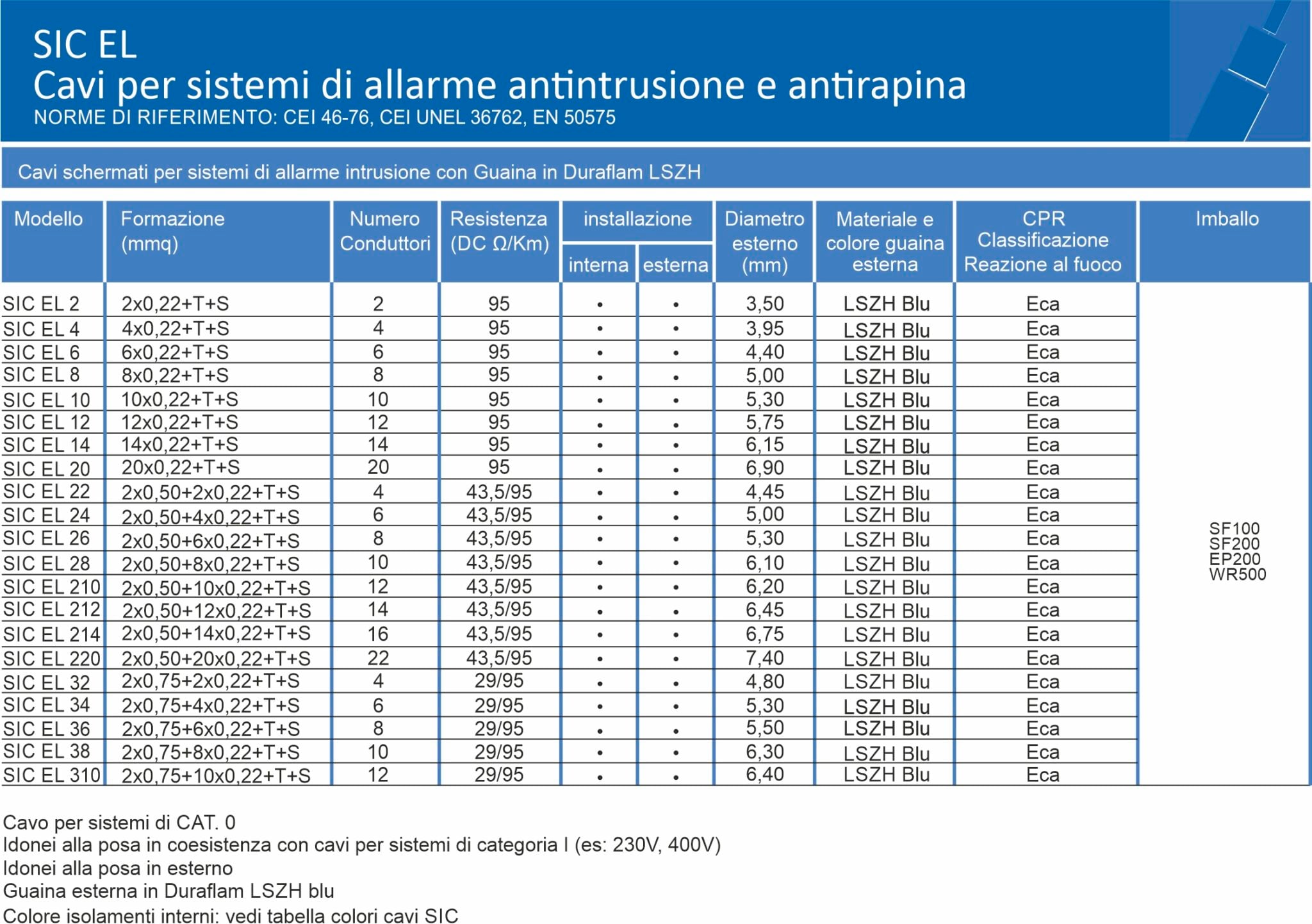 SIC E NHCavo per sistemi antintrusione idoneo alla posa in coesistenza con cavi energia 230V 400V .Realizzato con conduttori in rame, guaina in Duraflam LSZH idonea alla posa in interno.Euroclasse EcaFormazioni disponibile: 2x0,50 + 4x0,22 + T + SImballo: bobina di legno da 500m