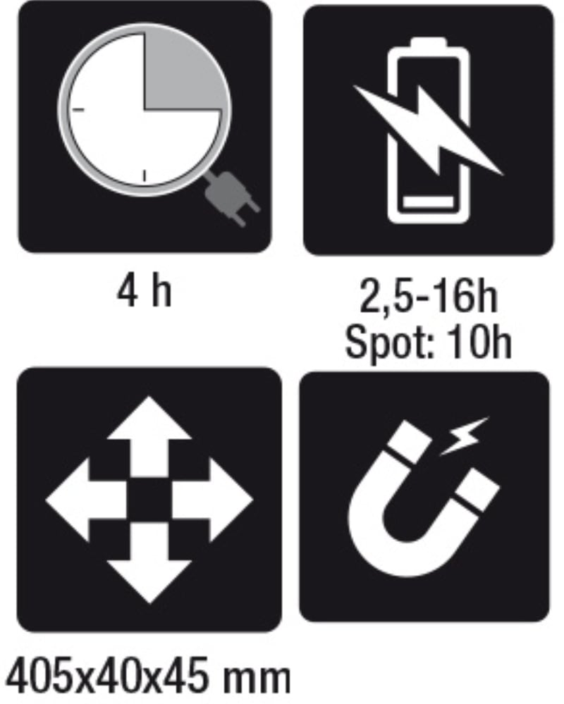 Caratteristiche:? Doppia emissione luminosa: frontale: LED COB, 60-700 lumen, regolabile con potenziometro spot (testa): LED SMD, 120 lumen, interruttore ON-OFF? Batteria ricaricabile 3.6V 2600mAh Li-ion? Attacco USB-C? Fornita con caricatore 100-240V / 50-60Hz? Tempo di ricarica: 4h? Autonomia: frontale: 2.5-16h spot (testa): 10h? Indicatore livello di batteria a 3 led? Snodata e orientabile a 180? (? 90? rispetto all'asse)? Base magnetica (con magnete al neodimio) orientabile a 90?? Gancio orientabile alla base? IP54? IK07