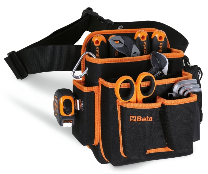 Caratteristiche:? Due ampie tasche con elastici portautensili ? Due taschine frontali porta forbice? Due pratici scomparti laterali con, a sinistra, taschino con robusto gancio in metallo per flessometro e, a destra, doppia tasca con sacca richiudibile tramite laccio e chiusura a zip aggiuntiva? Fibbia con moschettone porta nastro adesivo? Cintura regolabile da 70 a 120 cm? 260x250x190 mm