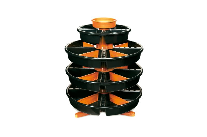 Caratteristiche:? Dotato di un contenitore portaminuteria superiore (diametro 145 mm) e 4 vassoi girevoli: 1 diametro 305 mm 3 diametro 445 mm? Fornito completo di 12 divisori applicabili all'interno dei 3 vassoi girevoli grandi per ottenere fino a 8 scompartimenti per piano? 445x445x550 mm - ? 3,4 kg