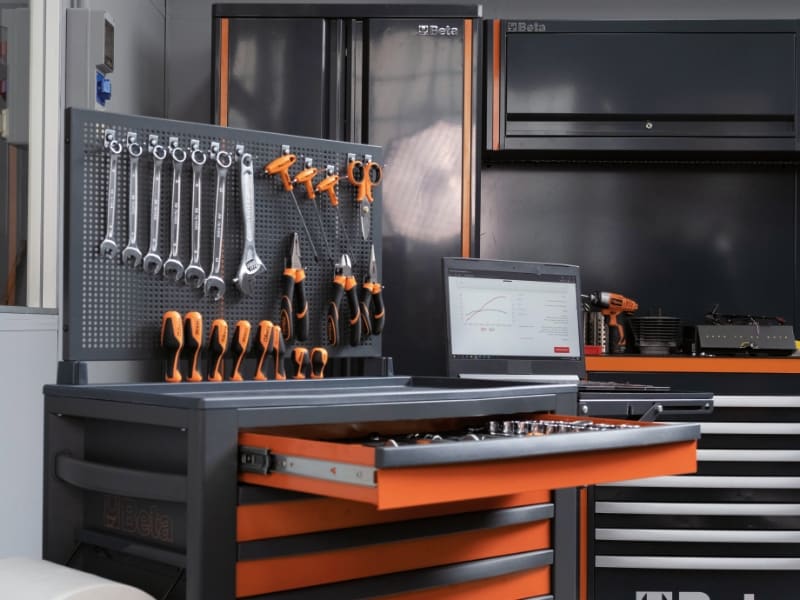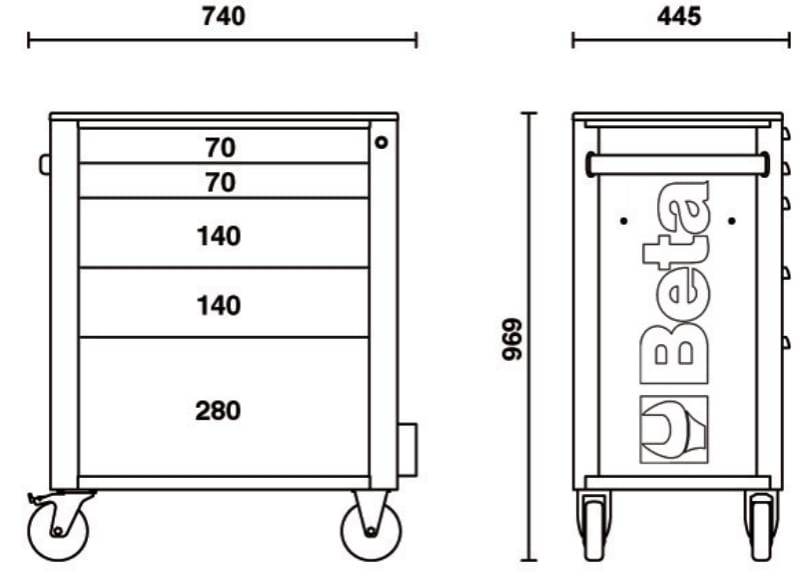 La cassettiera portautensili Beta RSC24/5 e l'evoluzione della storica cassettiera C24S, progettata per soddisfare le esigenze di ogni professionista. La struttura robusta e i materiali impiegati garantiscono un'elevata qualita e una lunga durata nel tempo. Il design, ispirato al mondo Racing, conferisce alla cassettiera uno stile accattivante e inconfondibile. RSC24/5 e inoltre disponibile in 7 colorazioni diverse e personalizzabile al massimo, grazie all'ampia gamma di accessori disponibili. Modello 5 cassetti da 588x367 mm a estrazione totale, montati su guide telescopiche a sfera:? 2 cassetti altezza 70 mm? 2 cassetti altezza 140 mm? 1 cassetto altezza 280 mm Caratteristiche: ? Piano di lavoro rinforzato in ABS, solido e robusto ? Piano di appoggio multifunzione con bordi anticaduta e 8 fori per l'alloggiamento dei giravite ? 4 ruote ? 125 mm di cui 2 fisse e 2 girevoli (una con freno) ? Serratura di sicurezza centralizzata frontale ? Capacita di carico statico pari a 800 kg ?Porta flaconi laterale integrato, applicabile su entrambi i lati ? Piano dei cassetti protetto da tappetini di gomma espansa ? Possibilita di inserire in ogni cassetto fino a 4 vassoi morbidi in EVA o termoformati rigidi in ABS Accessori integrabili: ? Piano di lavoro in legno 2400 RSC24/PL ? Pannello forato portautensili 2400 RSC24/PF ? Supporto porta computer 2400 RSC24/SPC ? Mensola pieghevole 2400 RSC24/MP ? Porta documenti 2400 RSC24/PD (grigio antracite o nero) ? Portacarta perrotoli preforati 2400 RSC24/PC (grigio antracite o nero)
