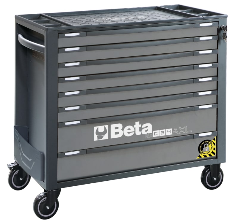 Modello lungo con 8 cassetti da 882x367 mm ad estrazione totale, montati su guide telescopiche a sfera:? 6 cassetti altezza 70 mm? 2 cassetto altezza 140 mm Caratteristiche: ? Nuovo piano di lavoro rinforzato in ABS con bordi anticaduta, otto fori per l'alloggiamento dei giravite e 6 vaschette portaminuterie ? Frontalino in nylon ad alta resistenza, con porta-etichette integrato ? Piano dei cassetti protetto da tappetini di gomma espansa ? Quattro ruote ? 125 mm di cui 2 fisse e 2 girevoli (una con freno) ? Serratura di sicurezza centralizzata frontale ? Capacita di carico statico pari a 1.000 kg ? Portaflaconi laterale integrato (applicabile su entrambi i lati) ? Possibilita di inserire in ogni cassetto fino a 6 vassoi morbidi in EVA o termoformati rigidi in ABS Accessori integrabili: ? Piano di lavoro in legno 2400 RSC24/PL ? Porta documenti 2400 RSC24//PD-A ? Portacarta per rotoli preforati 2400 RSC24/PC-A Sul piano di lavoro e collocabile a misura una cassettiera portatile RSC22, RSC23, RSC23C e RSC23T.