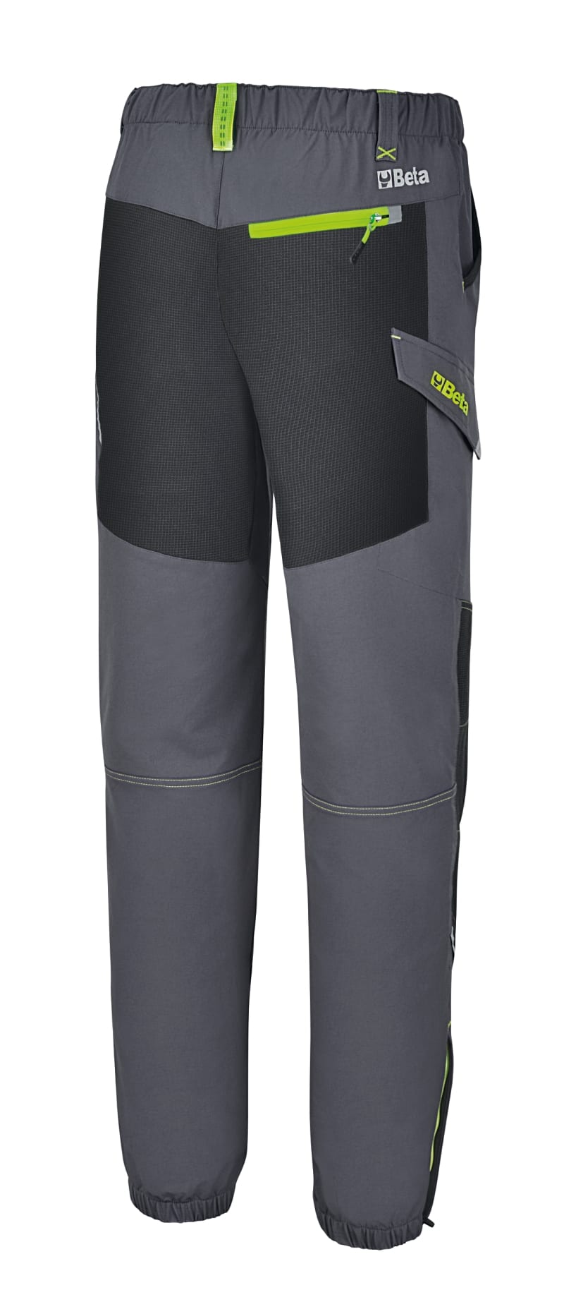 MATERIALI:90% nylon, 10% tessuto elasticizzato, 265 gCARATTERISTICHE:? Slim Fit? Tessuto a 4 direzioni (4WAY STRETCH) per aumentare il comfort? Inserti rinforzati su ginocchia e retro per aumentare la resistenza? Vita elasticizzata? Due tasche in vita ed una tasca posteriore con chiusura zip? Una tasca laterale con chiusura a strappo? Fondo gamba elasticizzato con chiusura zip verticale? Inserti reflexCOLORE:Grigio scuro con dettagli verde fluoTaglie:XS, S, M, L, XL, XXL, XXXL46, 48, 50, 52, 54, 56, 58 MASSIMO COMFORT ? Il tessuto elasticizzato e in grado di seguire ogni movimento per garantire la massima comodita. ? Le cuciture preformate sul ginocchio aumentano il comfort. RESISTENZA E DURATA L'aggiunta di inserti in tessuto elasticizzato, altamente resistente all'abrasione, rende i pantaloni ancora piu duraturi. DESIGN E PRATICITA Il design innovativo e ispirato all'abbigliamento da montagna e l'elemento distintivo dei pantaloni ;work trekking; che combinano comodita con linee semplici e accattivanti.