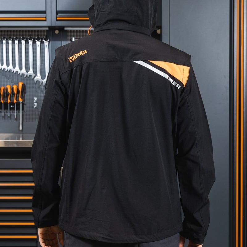 Composizione:? Tessuto: 86% nylon, 14% spandex, 140 g ? resistente all'acqua, antivento, traspirante e a rapida asciugatura Design:? Cappuccio a scomparsa, foderato, con regolatori a coulisse ? Maniche staccabili ? Chiusura frontale con zip ? Una tasca al petto con chiusura zip ? Due tasche in vita con chiusura zip ? Una tasca interna ? Vita regolabile con coulisse ? Polsini elasticizzati Colore:nero Taglie:XS, S, M, L , XL, XXL, XXXL