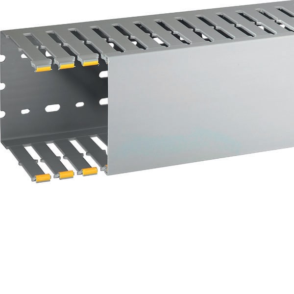 Canalette in PVC autoestinguente per il cablaggio di quadri elettrici, progettate per un'installazione sicura e ordinata. Dotate di coestruso morbido giallo sulle lamelle, misurano b100 x h100 mm con modulo 20 mm (feritoria 8 mm, lamella 12 mm). Conformialla norma UL94 V0 e resistenti al filo incandescente fino a 960 °C (GWT EN 60695-2-11). Colore grigio RAL 7030, lunghezza 2 m, complete di coperchio.
