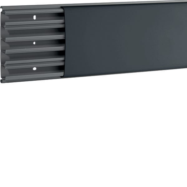 Canali porta apparecchi e porta cavi in plastica per installazione a battiscopa e cornice, completi di coperchio e base sono realizzati in PVC di colore nero ardesia RAL 7021. Misurano b127 x h28 mm e 2 m di lunghezza e presentano 5 scomparti. Offrono protezione IP40 e resistenza agli impatti IK08. Il materiale di cui sono composti impedisce la propagazione della fiamma e i coperchi sono smontabili con attrezzo.