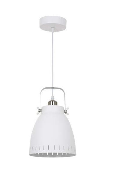 Lampada a sospensione Sansa 220-240V in stile industriale. Corpo in metallo bianco. Incluso cavo da 1,5 metri e coppa da soffitto. Monta una sorgente led con attacco E27 – 40W max. (non inclusa).