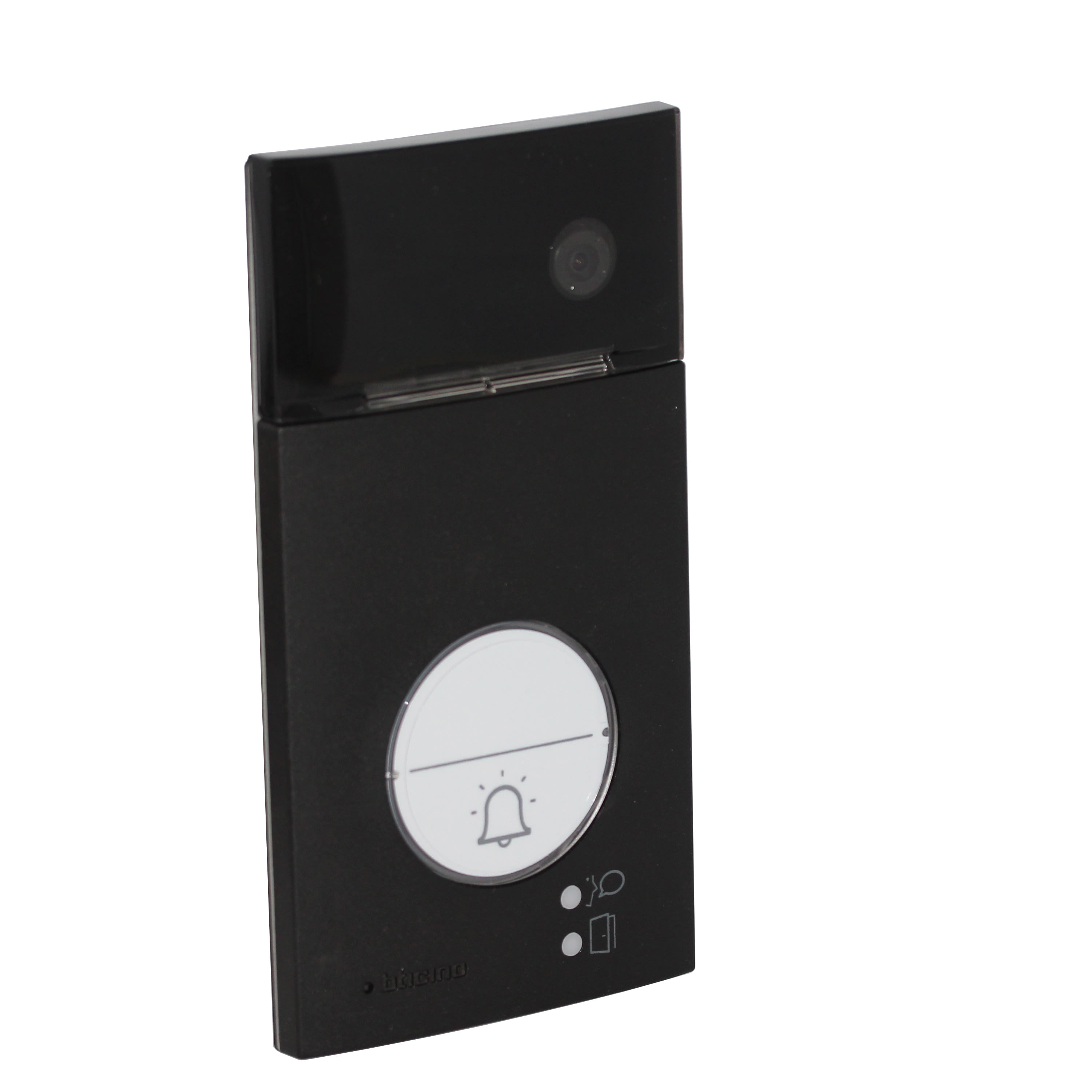 Pulsantiera video 2 FILI da parete con frontale in zama finitura nera, telecamera a colori grandangolare e lettore di prossimità. LED bianchi per illuminazione campo di ripresa in condizioni di scarsa luminosità. Configurabile per installazioni monofamiliari o bifamiliari. Permette l’apertura di una elettroserratura collegata direttamente tra i morsetti S+ ed S- (18 V 4 A impulsivi, 250 mA di mantenimento, 30 Ohm max). Gestisce un numero massimo di 20 badge (125 KHz) per l’apertura dell’elettroserratura (compreso quello di gestione impianto). Illuminazione del cartellino portanome con LED bianco. Risponde al grado di protezione IP54 – grado di robustezza IK10. A corredo 1 kit apriporta composto da : 6 badge colorati e 2 clear discs.