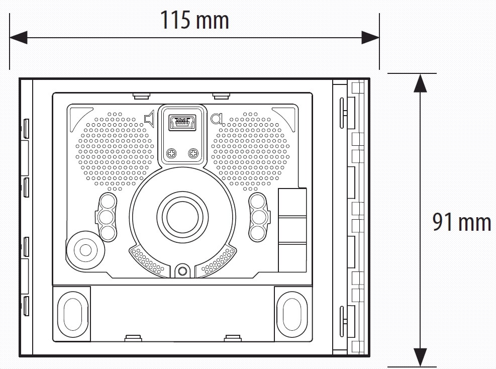 Modulo audio video grandangolare per la realizzazione di impianti videocitofonici a colori 2 fili. Dotato di telecamera a colori con sensore da 1/3“ e LED bianchi per illuminazione del campo di ripresa. Resistenza di preriscaldo antiappannamento. Regolazioni volume altoparlante e microfono. Gestisce fino ad un massimo di 98 chiamate a pulsanti utilizzando moduli pulsanti su doppia fila aggiuntivi. Consente l’attivazione di una elettroserratura collegata direttamente ai morsetti S+ ed S- (18 V 4 A impulsivi - 250 mA mantenimento su 30 Ohm max) ed il collegamento di un pulsante apriporta locale sui morsetti PL. Predisposto per alimentazione supplementare. Dotato di LED frontali per la segnalazione dello stato di funzionamento: apriporta, comunicazione attiva, chiamata inoltrata e sistema occupato. Sensore ottico integrato per l’accensione della retroilluminazione notturna. Da completare con frontale di finitura. Il dispositivo deve essere configurato fisicamente oppure tramite PC e software TiSferaDesign.