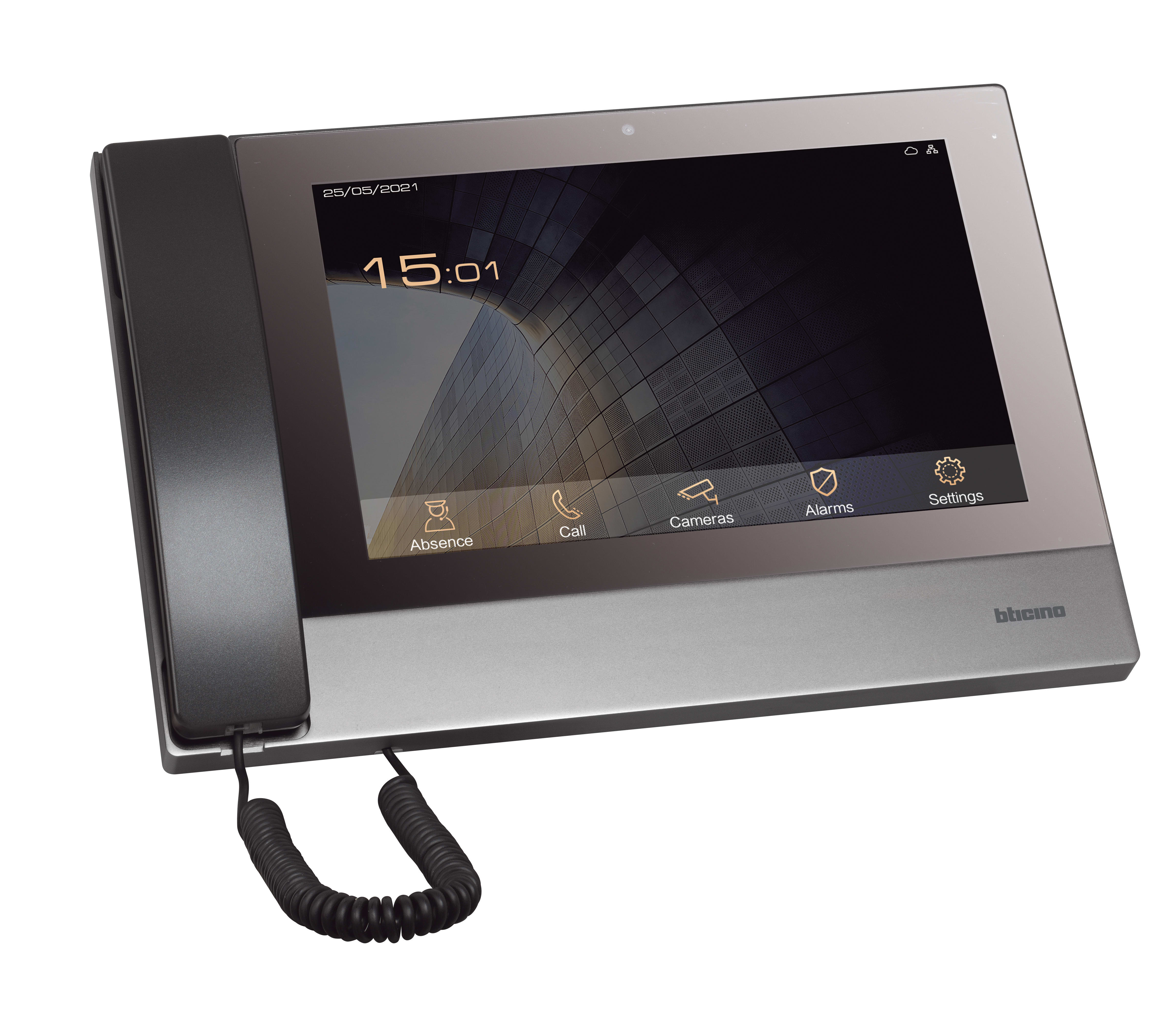 Centralino di portineria con display touch 10” e cornetta audio. Tramite il display touch è possibile: rispondere e trasferire chiamate, visualizzare i registri delle chiamate, attivare l’apertura delle elettroserrature, monitorare le telecamere Onvif IPinstallate nelle aree comuni, monitorare ed elaborare gli allarmi. Dallo specifico menù è possibile accedere alle impostazioni del centralino di portineria, come volume e luminosità del display, ed eseguire test di funzionalità e di rete. È possibile attivare la modalità assenza Rapida e Programmata per trasferire la chiamata ad un altro centralino di portineria o agli appartamenti, se necessario. Il centralino può essere alimentato tramite PoE (power over Ethernet) o direttamente tramite l\'alimentatore 375005.