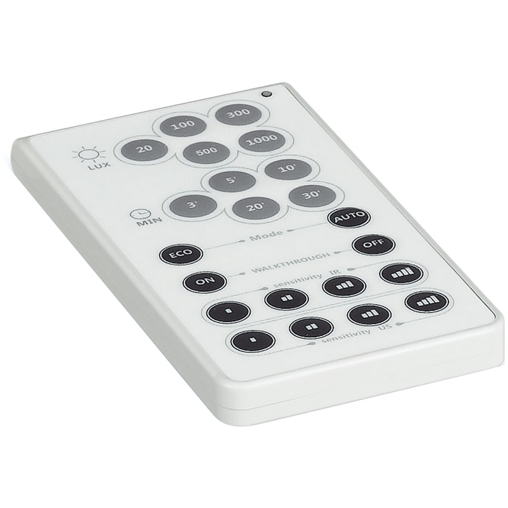 Telecomando di configurazione base, dotato di trasmettitore ad infrarossi, permette la regolazione dei principali parametri di funzionamento di: Switch Sensor, Green Switch e dei sensori SCS compatibili. Permette la modifica dei parametri solo per valoripre impostati, ricarica delle batterie non disponibile