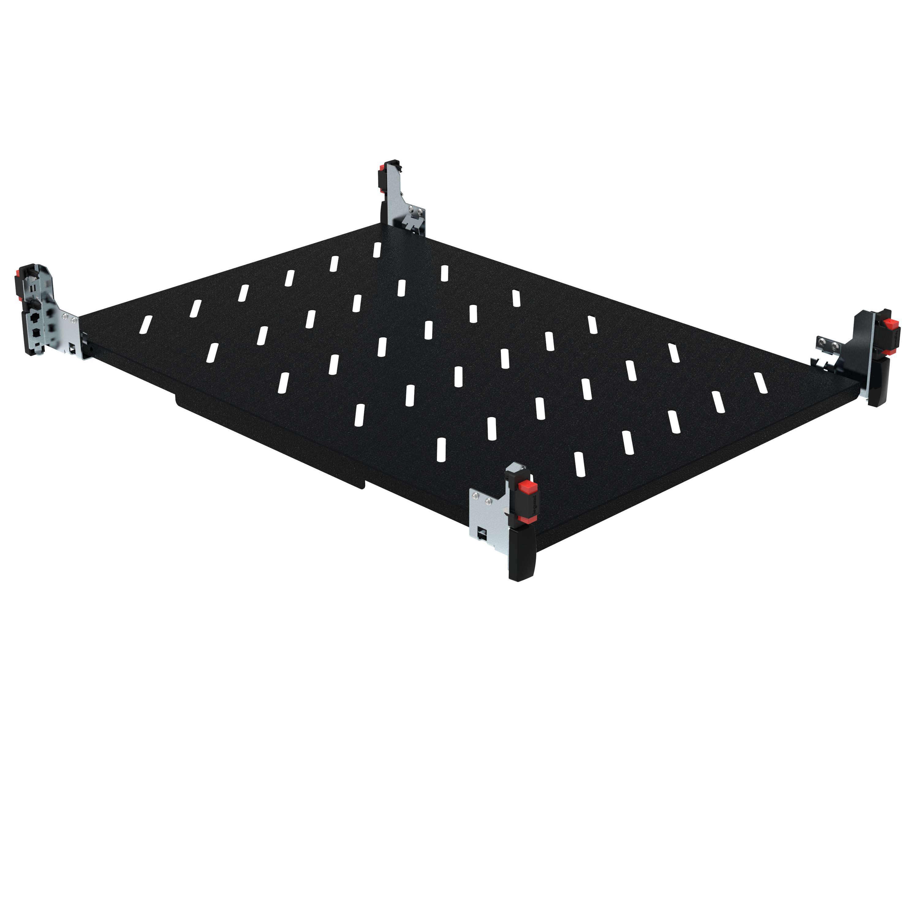 mensola di supporto fissa in lamiera per apparati attivi - profondità 450 mm - per installazione in armadi profondità 600 mm modulari 19” - fissaggio su 4 montanti 19” - portata massima 50kg - colore nero RAL9005 - fissaggio diretto senza viti - 1 unitàrack