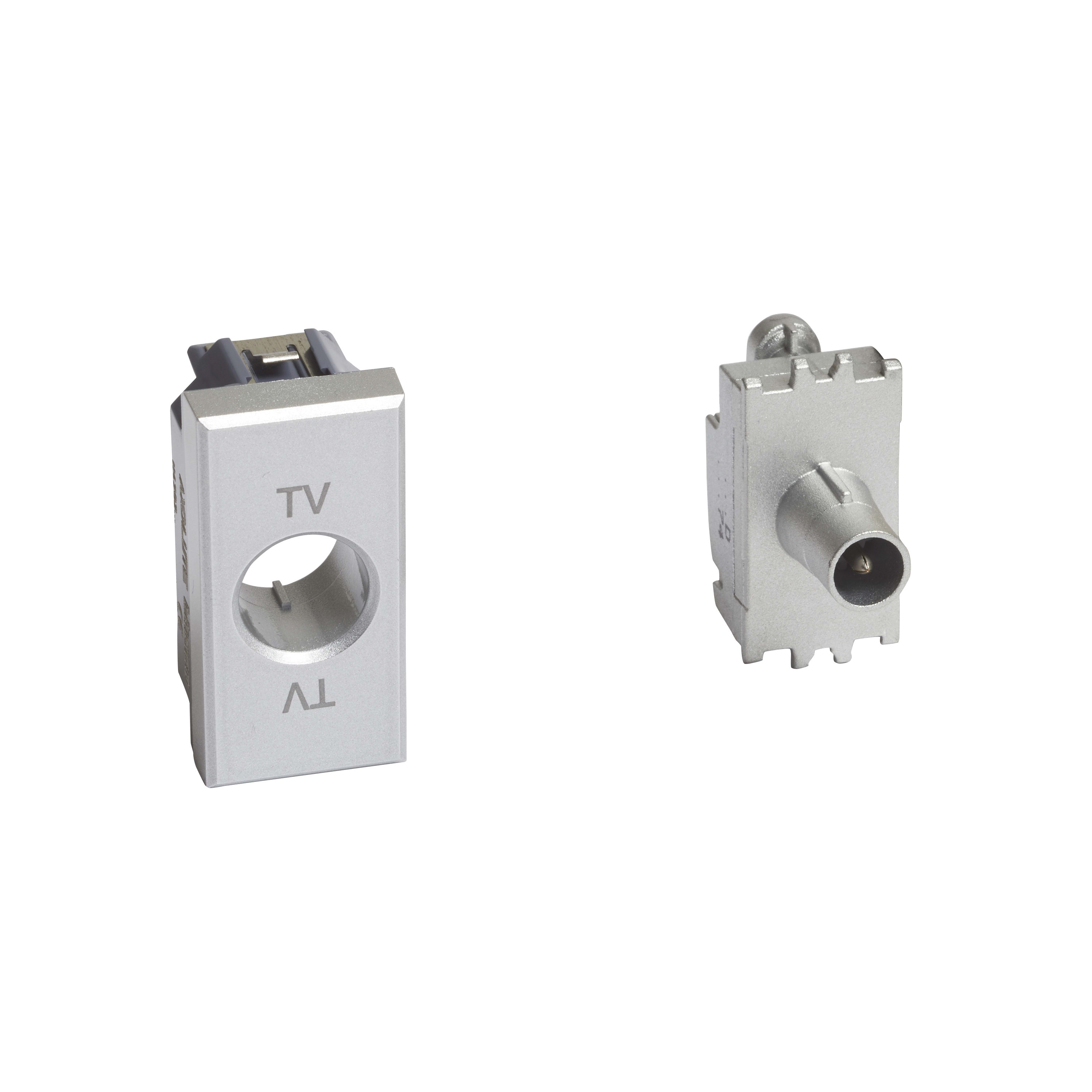 presa coassiale passante terminale, attenuazione 10dB, per impianti di antenna centralizzati anche telealimentati e centralizzati ed impianti via satellite centralizzati con passaggio di corrente e di segnale per la selezione dei canali - morsetti di collegamento schermati con viti imperdibili - Ø 9,5 mm - connettore maschio - adattatore finale di impedenza 75 Ω incorporato - fornita in confezione con motore neutro e mostrine di finitura negli stessi colori dei meccanismi - 1 modulo