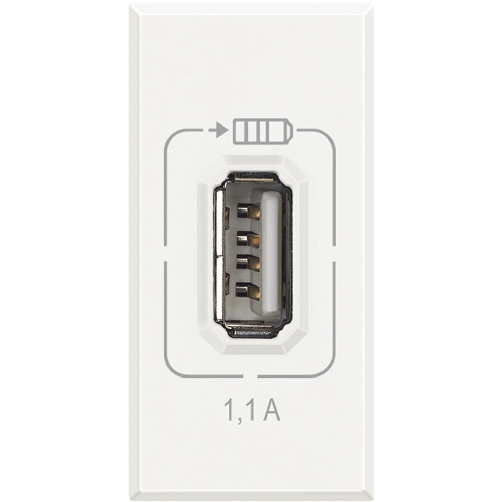 Caricatore USB con tensione 5 Vd.c. per la sola ricarica di dispositivi elettronici fino a 1500 mA quali cellulari, smartphones, tablets e similari - alimentazione 230 Va.c. - 1 modulo - Bianco