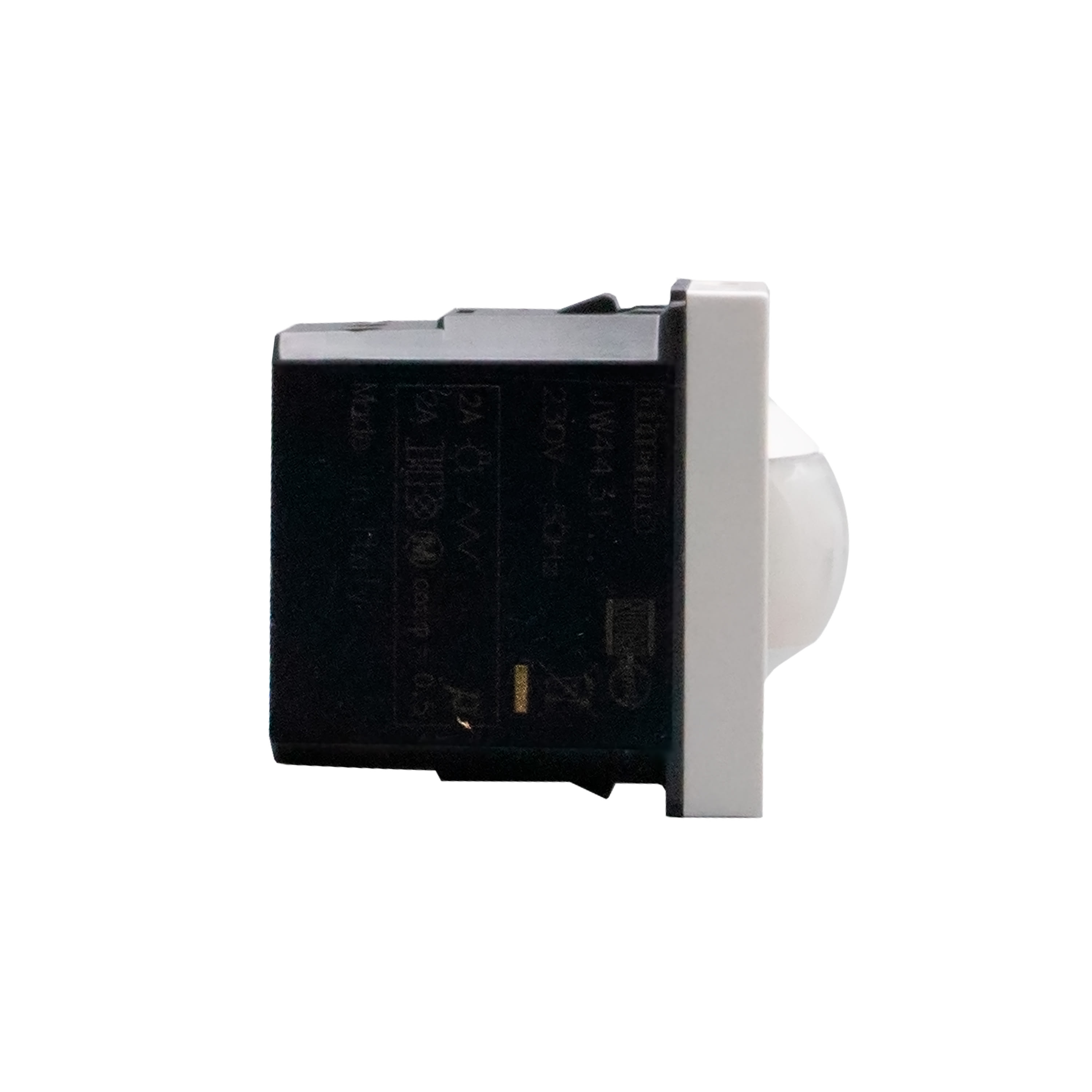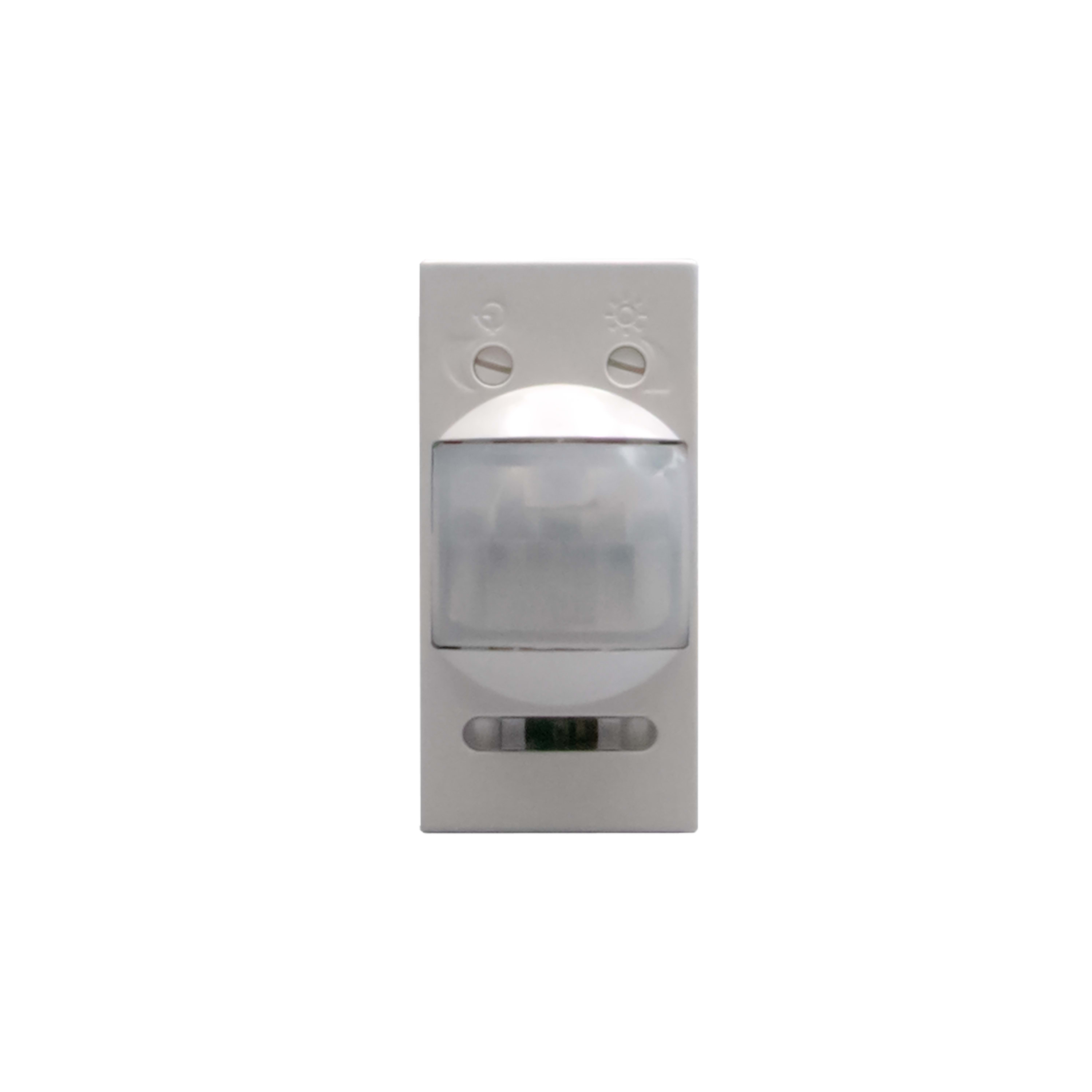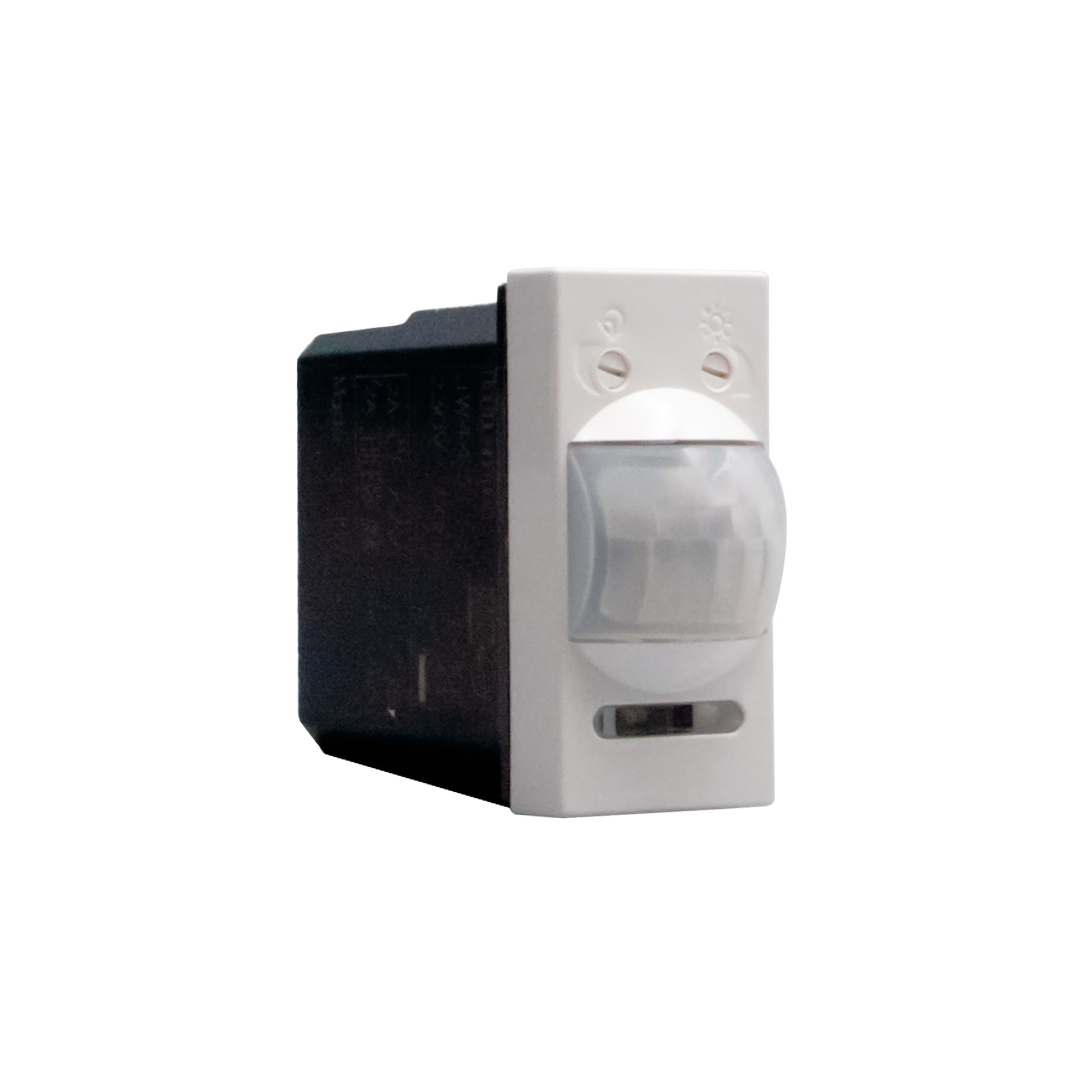Interruttore con sensore di movimento a raggi infrarossi passivi adatto per tutti i tipi di carico comprese lampade LED - 3 fili - circuito crepuscolare a soglia variabile con possibilità di esclusione - circuito di temporizzazione per ritardo spegnimento regolabile da 30 secondi a 10 minuti - alimentazione 230 Va.c. - 1 modulo - bianco