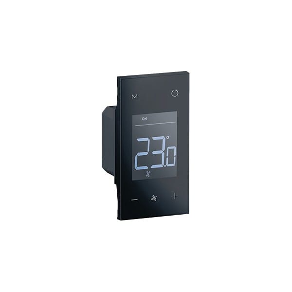 Termostato serie Living Now da incasso dotato di display retroilluminato e sonda incorporata per monitoraggio della temperatura ambiente . Utilizzato per gestire diversi tipi di sistemi di riscaldamento/raffrescamento (Fan Coil Units, valvole di riscaldamento/raffreddamento) in combinazione con controller KNX per il condizionamento/riscaldamento art. 002672/73/74/76/78/79 o art. 0 028 90. Regolazione del set-point di temperatura, della velocità della ventola e delle modalità di funzionamento. Installazione ad incasso - Dimensioni 2 moduli - Colore nero.