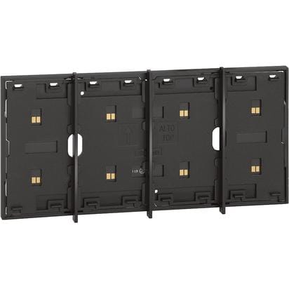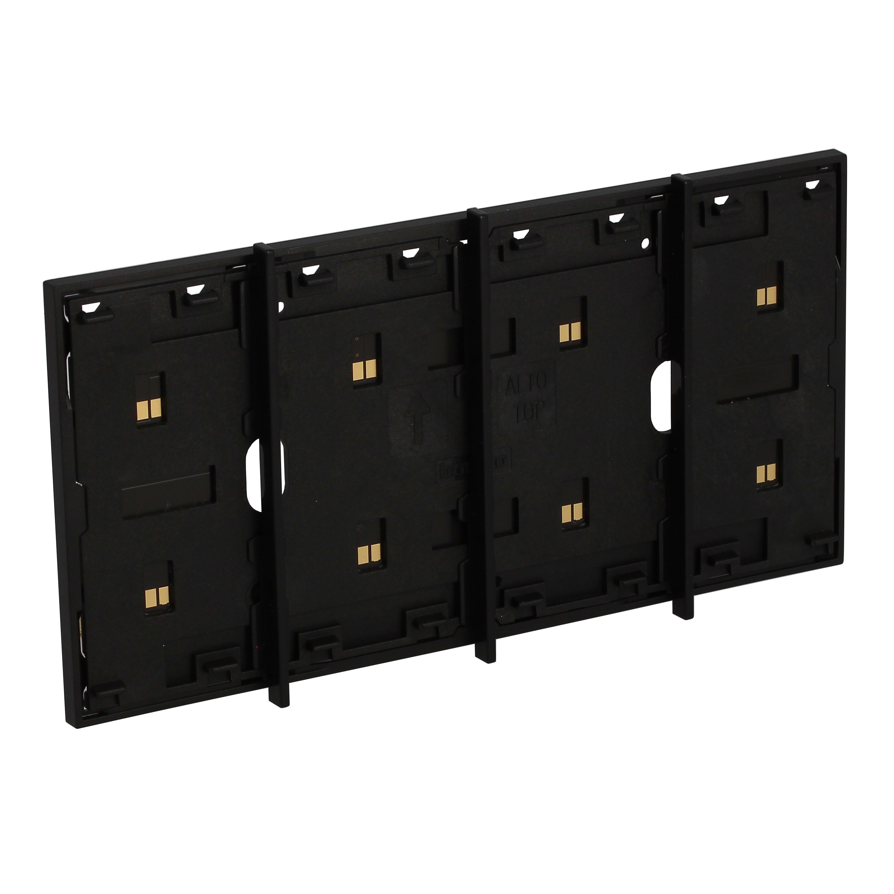 Frame elettrificato con barrette estetiche (rimovibili) di divisione tra i comandi. Per l’installazione di max. 4 comandi digitali o cover art. KW/KG/KM8100. Installazione in scatola da 3 moduli con supporto K4703. Colore nero.