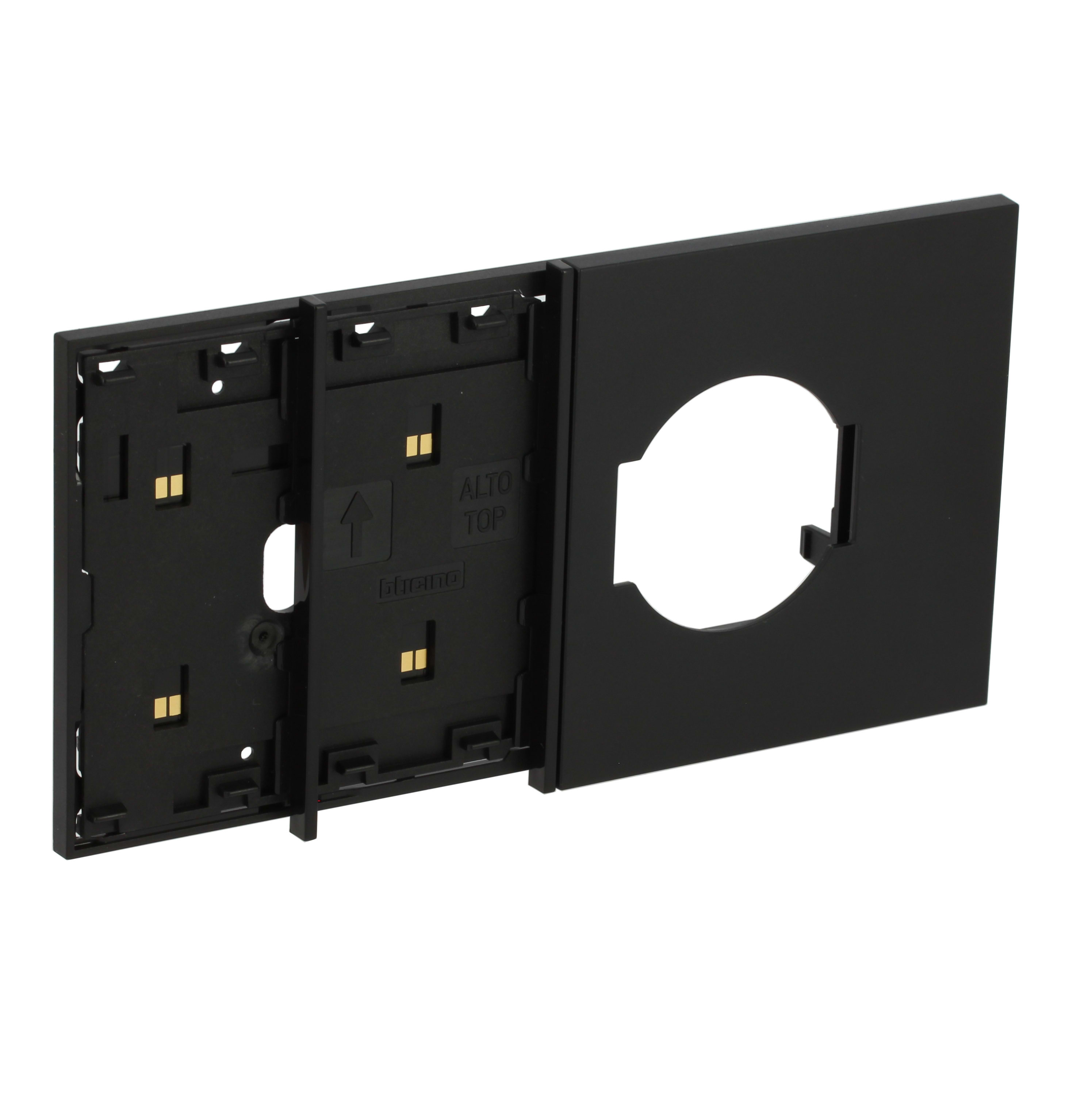 Frame elettrificato con mostrina presa standard italiano e tedesco, per l’installazione di 2 comandi digitali e di una presa 2P+T (articoli compatibili: KG4140A16, KG4140A16F). Installazione in scatola da 4 moduli con supporto K4704. Colore nero.