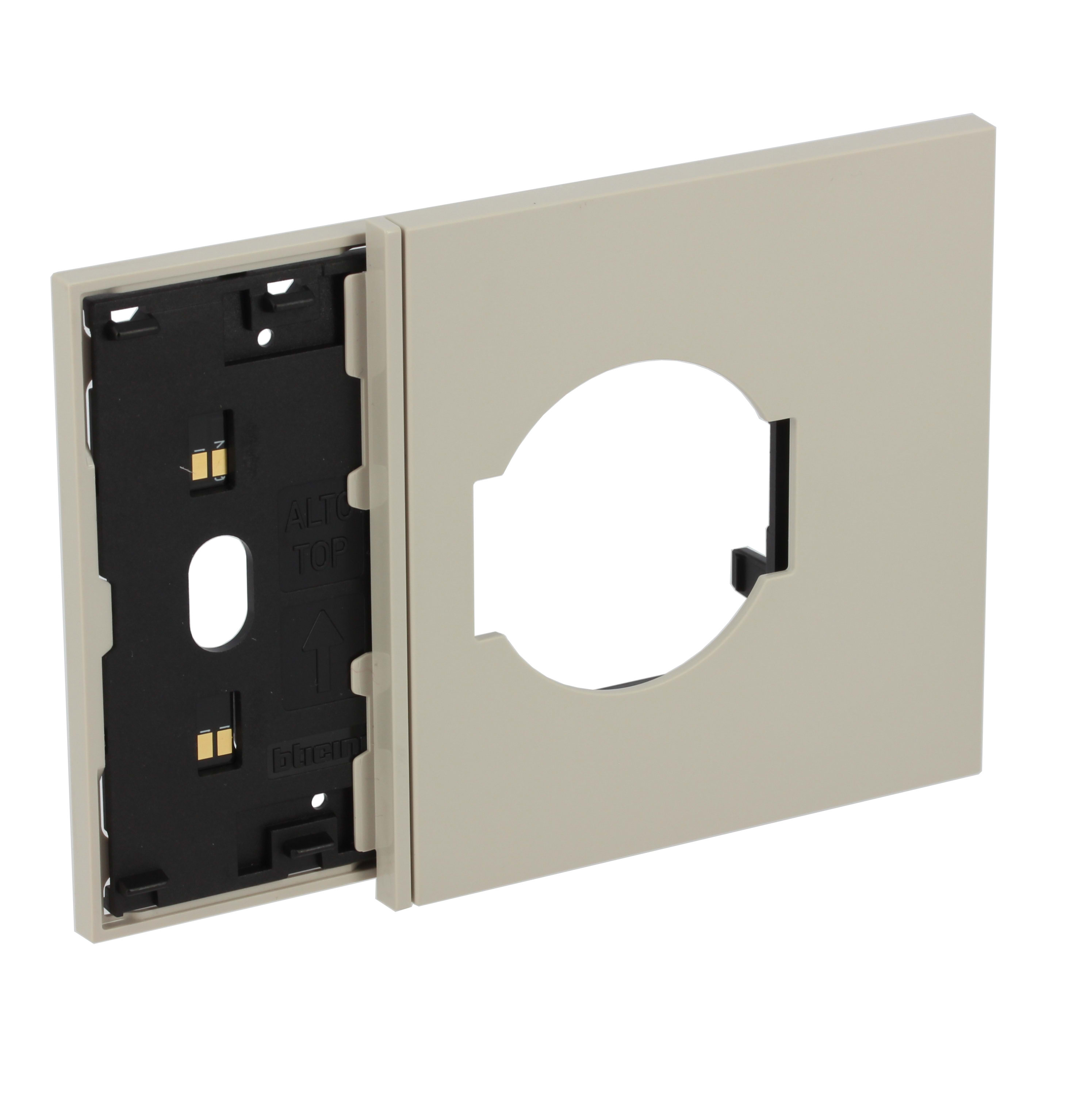 Frame elettrificato con mostrina presa standard italiano e tedesco, per l’installazione di 1 comando digitale e di una presa 2P+T (articoli compatibili: KM4140A16, KM4140A16F). Installazione in scatola da 3 moduli con supporto K4703. Colore sabbia.