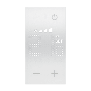 Sonda con display retroilluminato per il controllo della temperatura di una singola zona. È dotato di un ingresso per il collegamento di una linea contatti (es. contatto finestra). Permette la gestione di diverse tipologie di impianto e la regolazione della velocità della ventola in caso di impiego di fan coils. Possibilità di funzionamento automatico (estate/inverno) con impianti compatibili - 2 moduli, bianco